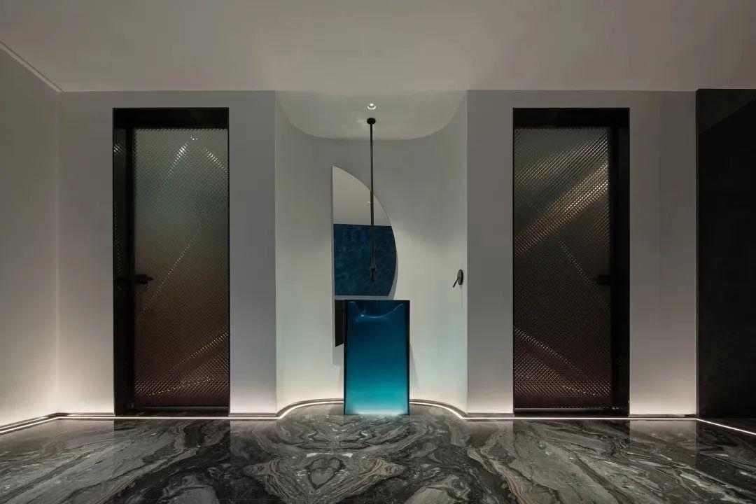 埡口處設(shè)計(jì)公共洗漱區(qū),半圓形鏡面與Antoniolupi洗手盆相映成趣,水滴形懸掛水龍頭宛如點(diǎn)睛之筆,整體布局既實(shí)用又富有藝術(shù)感,仿佛一件精心布置的藝術(shù)裝置,提升了空間的美學(xué)與實(shí)用性。